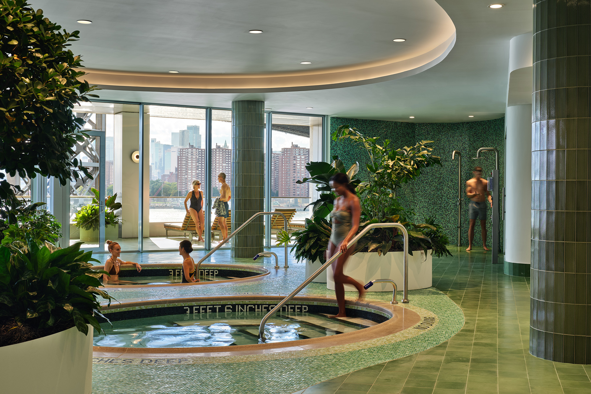 - Poolside showers and rinse areas