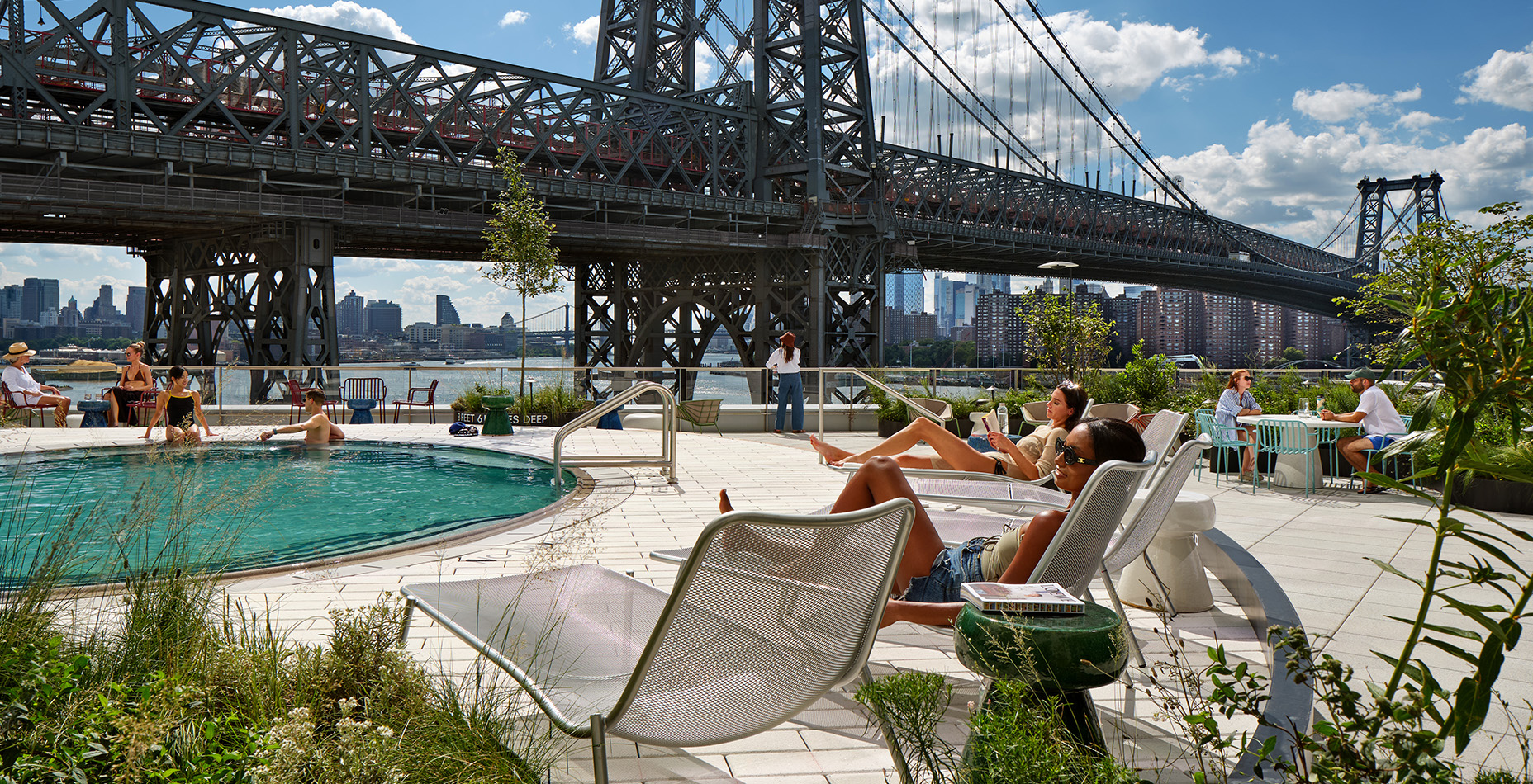 The Gardens at One Domino Square offer a lush retreat with picnic lawns, shaded green spaces, and al fresco dining areas all overlooking the New York skyline, East River and Domino Park.