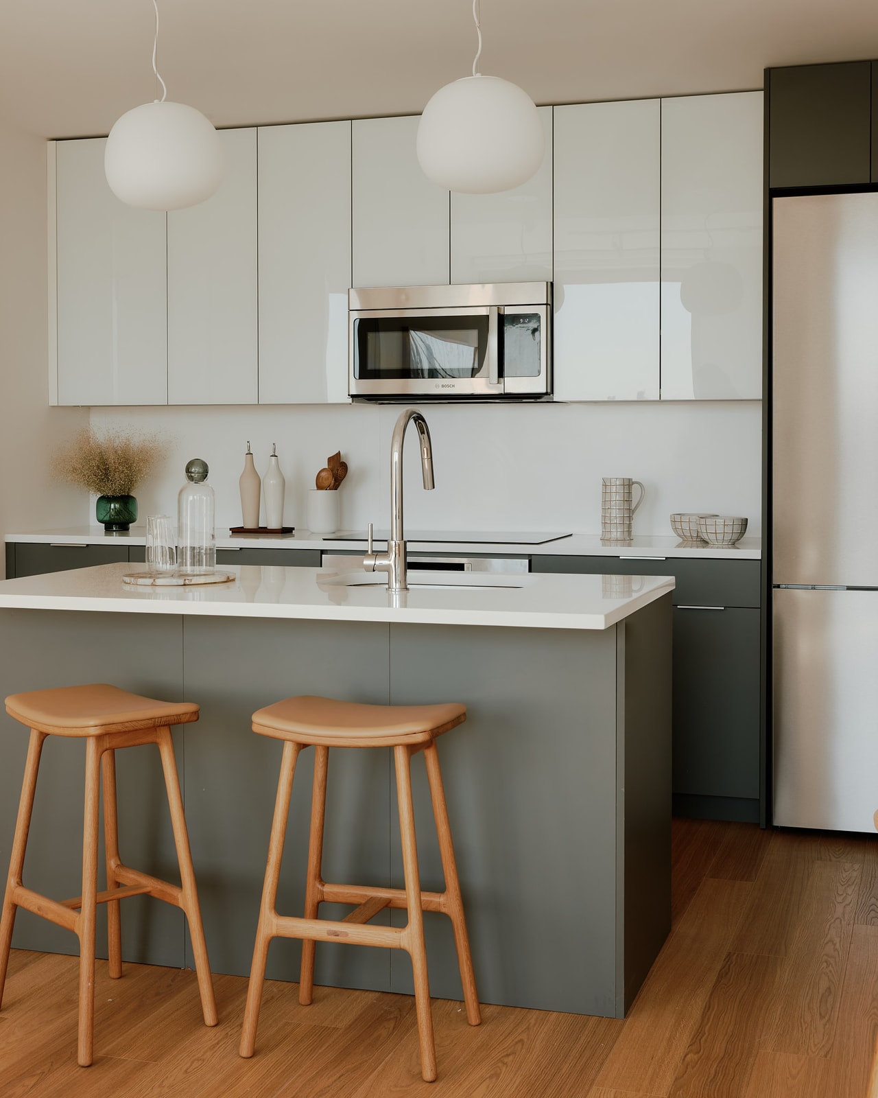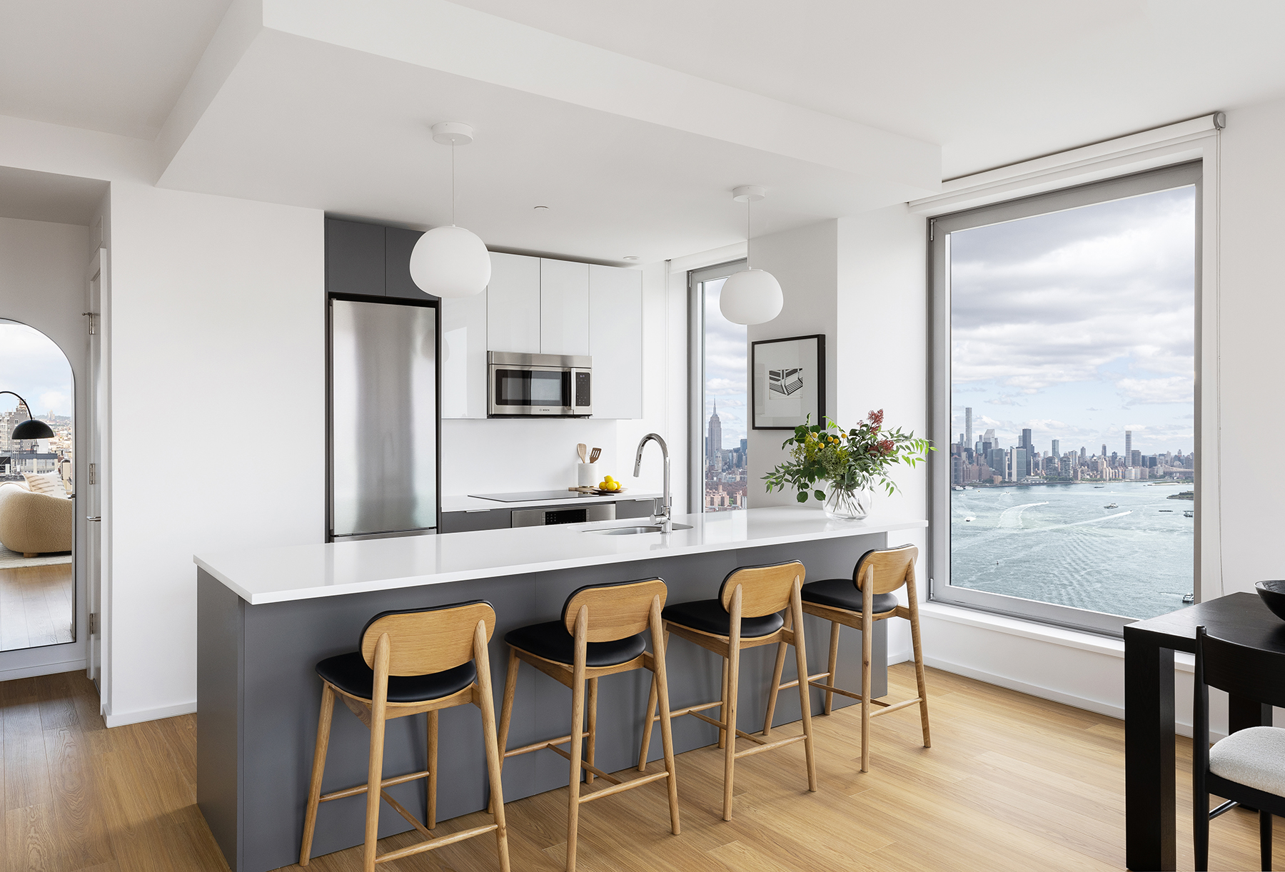 Large windows frame panoramic water and city views, offering spectacular vistas. Kitchens are crafted for culinary perfection with Caesarstone countertops and Bosch appliances. The bathrooms present a clean, sleek design and offer a spa-like retreat. Details such as washer dryers in every unit, living room and bedroom shades, dimmable LED track lighting and customized closets have been thoughtfully added for an elevated living experience.
